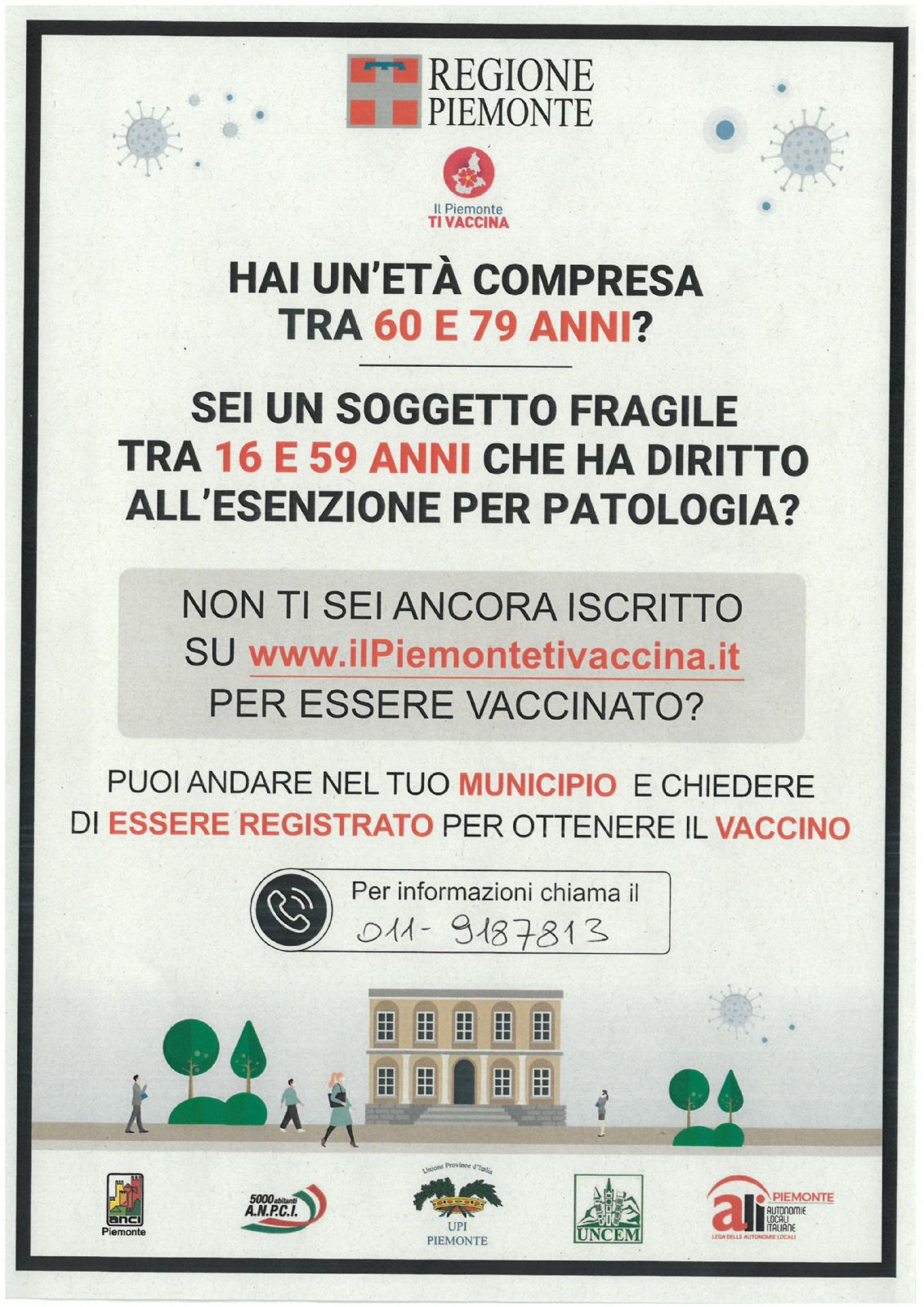 Sono aperte le iscrizioni sul sistema regionale vaccinale per i soggetti fragili dai 16 ai 59 anni. Coloro che avessero difficoltà ad effettuare online la registrazione, o anche solo per informazioni in merito, è possibile rivolgersi agli uffici comunali al num. 011 9187813