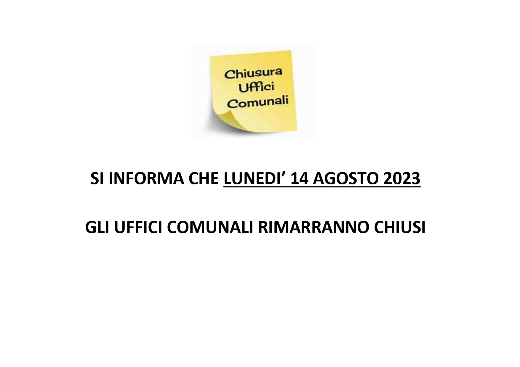 SI COMUNICA CHE LUNEDI' 14 AGOSTO GLI UFFICI COMUNALI RIMARRANNO CHIUSI