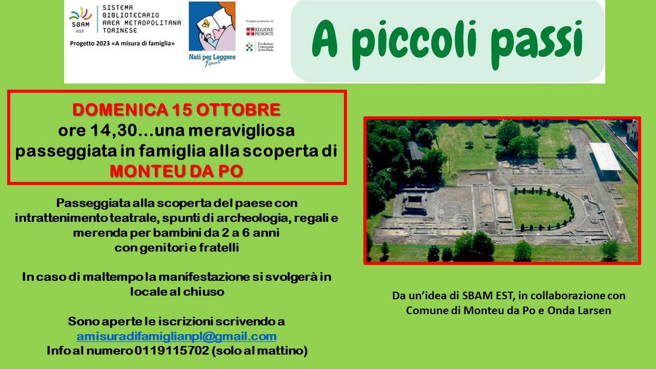 Lo SBAM EST, a seguito del progetto "A misura di famiglie" organizza una passeggiata in famiglia alla scoperta del nostro paese. Domenica 15 ottobre ore 14.30 (ritrovo presso Area archeologica di Industria).