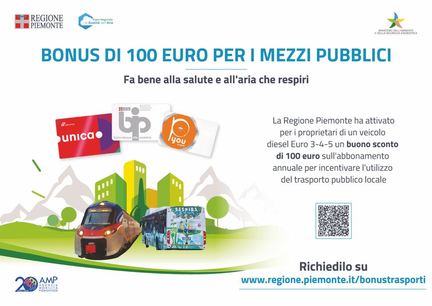 La Regione Piemonte ha introdotto il Bonus TPL - Bonus Trasporto Pubblico Locale, in attuazione del Piano Regionale di Qualità dell’Aria, al fine di promuovere l'uso del trasporto pubblico e della mobilità collettiva e ridurre le emissioni degli inquinanti in atmosfera (principalmente polveri sottili e ossidi di azoto).