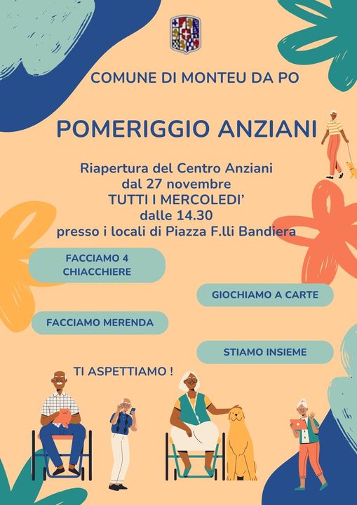 Si informa che dal 27 novembre riapre il Centro Anziani, tutti i mercoledì dalle ore 14,30, presso i locali di piazza Fratelli Bandiera.