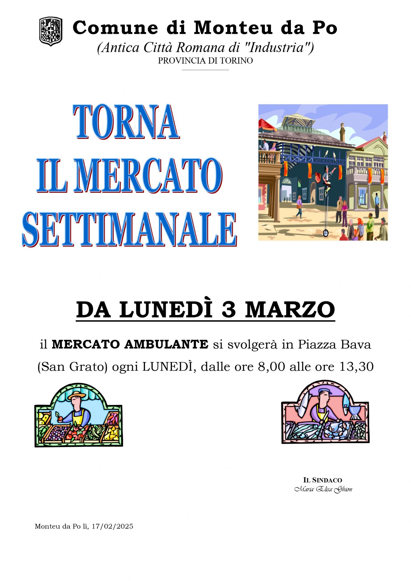 Con deliberazione di Giunta Comunale n. 9 del 14/02/2025 si è disposta la ripresa di un mercato settimanale in forma sperimentale per il periodo marzo-dicembre, nella giornata del lunedì dalle ore 8.00 alle ore 13.30, presso Piazza Bava, lato nord, costituito da n. 10 posteggi, destinati agli operatori del commercio su area pubblica e agli imprenditori agricoli, debitamente autorizzati al commercio su area pubblica a norma del D.Lgs. n. 228 del 2001, che presenteranno richiesta di assegnazione del posteggio.