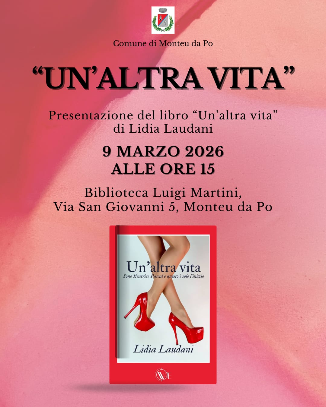 Il Comune di Monteu da Po è lieto di invitare alla presentazione del libro “Un’altra vita” di Lidia Laudani, in programma lunedì 9 marzo 2026 alle ore 15 presso la Biblioteca Civica “Luigi Martini”, in Via San Giovanni 5.