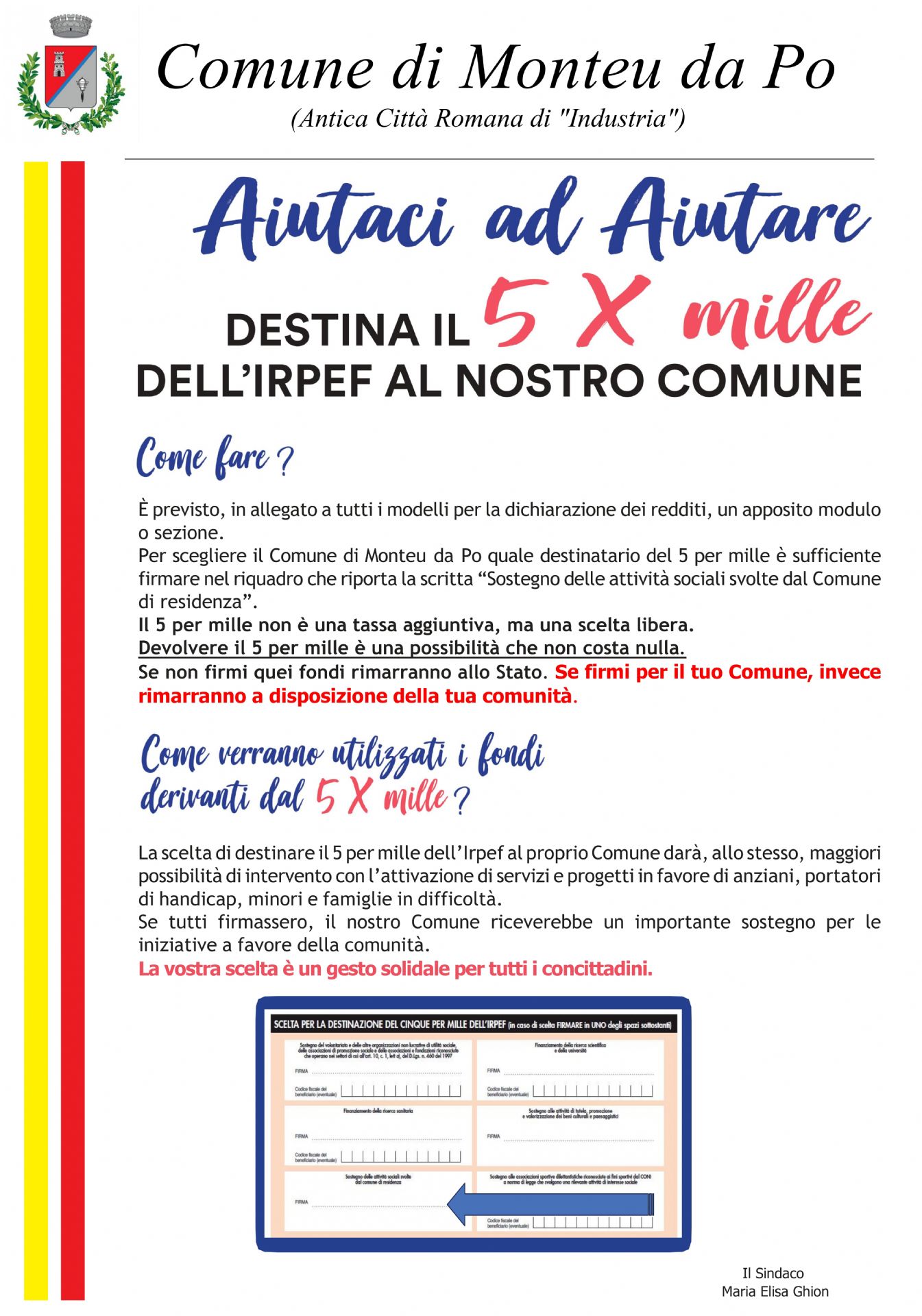 • Il 5 x mille è la quota dell’Imposta sul reddito delle persone fisiche (IRPEF) che, sulla dichiarazione dei redditi, puoi scegliere di destinare a organizzazioni non profit oppure al tuo Comune di residenza per sostenere attività di carattere sociale.