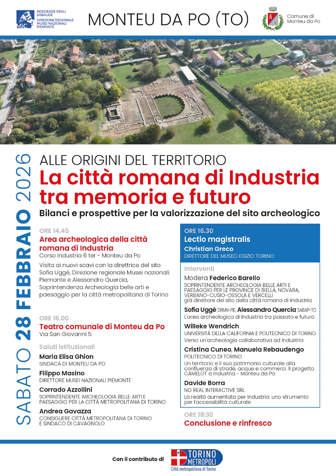 Il Comune di Monteu da Po invita la cittadinanza a partecipare all’iniziativa “Alle origini del territorio. La città romana di Industria tra memoria e futuro. Bilanci e prospettive per la valorizzazione del sito archeologico”, in programma sabato 28 febbraio 2026 a Monteu da Po.