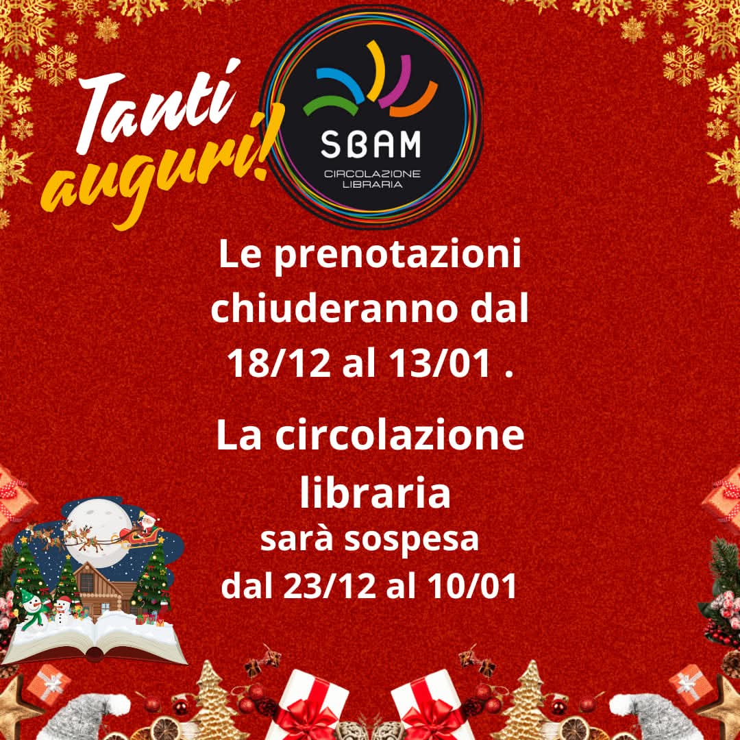 Le prenotazioni del sistema librario SBAM (Sistema Bibliotecario dell'Area Metropolitana Torinese) chiuderanno dal 18/12 al 13/01 e la circolazione libraria sarà sospesa dal 23/12 al 10/01.