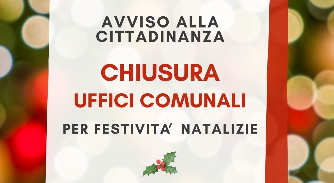 Si informa la cittadinanza che, in occasione delle festività natalizie, gli Uffici Comunali resteranno chiusi nelle giornate di mercoledì 24 dicembre e mercoledì 31 dicembre.
