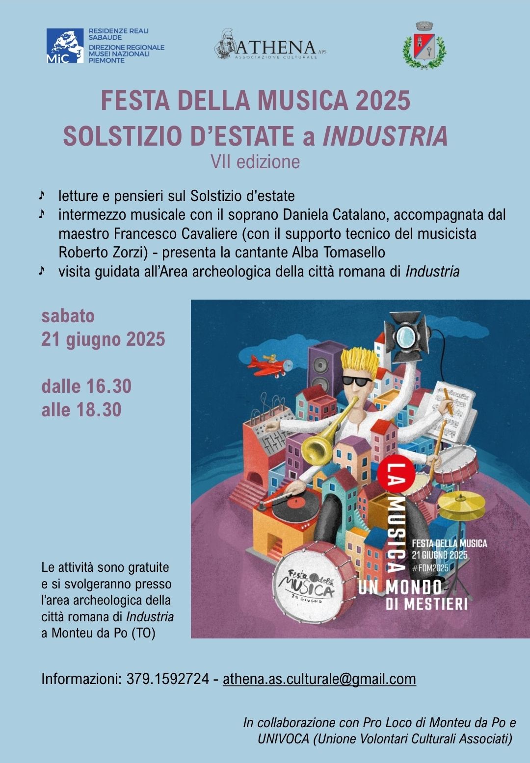 Sabato 21 giugno dalle 16.30 alle 18.30 l’Area archeologica di Industria sarà lo scenario della VII edizione della manifestazione "Solstizio d'estate", in collaborazione con l’Associazione Culturale Athena, Univoca, il Comune di Monteu da Po e la Pro Loco.