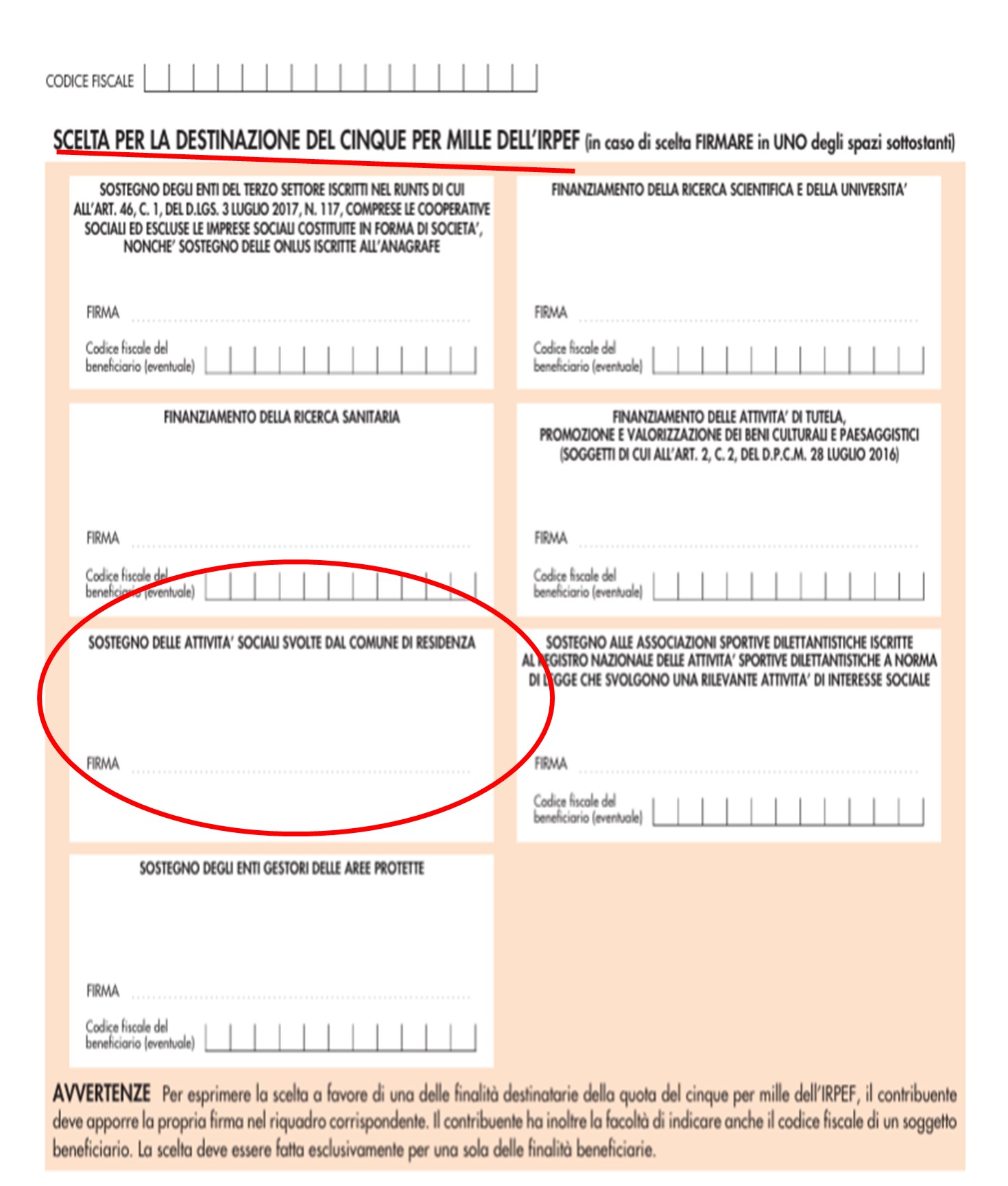 • Per scegliere di dare il 5 x 1000 al Comune, basta mettere la tua firma sul modello per la dichiarazione dei redditi nello spazio dedicato al 5 x 1000 all’interno del riquadro “attività sociali svolte dal Comune di residenza”.